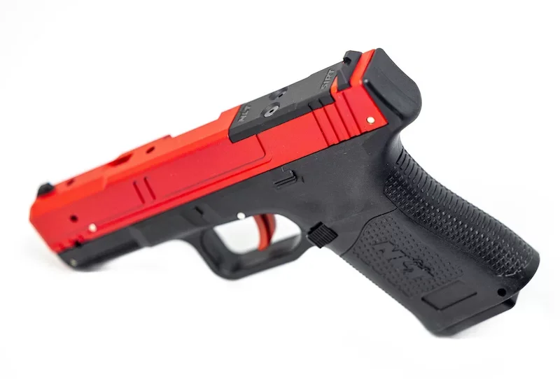 The other way is a replica gun made by LaserAmmo. A replica gun is a great way to ensure there is no way you are using live ammunition, as it cannot be loaded. LaserAmmo makes several versions that are identical to handguns from Glock, CZ, Smith & Wesson, Sig Sauer, Beretta, and more. Like the CoolFire, there is a laser threaded onto the end of the barrel. The recoil comes from its use of commonly available Green Gas.